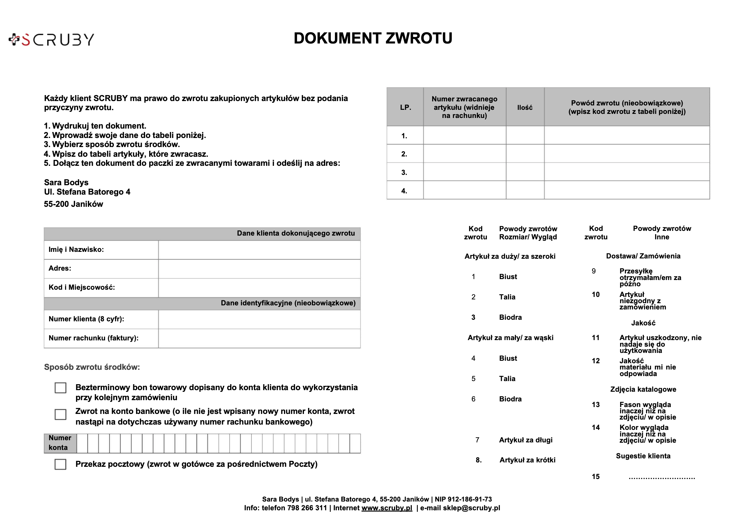 - Sprzedawca – Sara Bodys wpisana do centralnej ewidencji przedsiębiorców pod numerem NIP 912-186-91-73